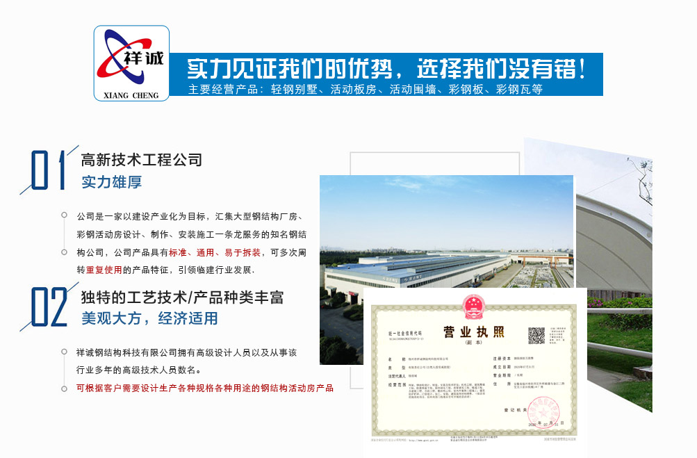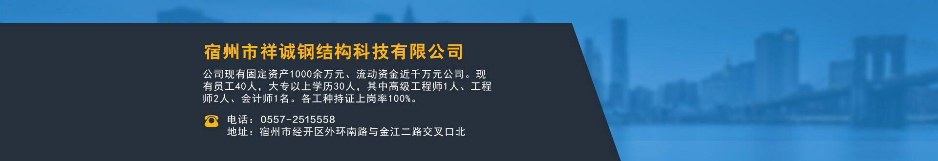 宿州市祥誠(chéng)鋼結(jié)構(gòu)科技有限公司位于宿州市經(jīng)開(kāi)區(qū)外環(huán)南路與金江二路交叉口北,公司是一家以建設(shè)產(chǎn)業(yè)化為目標(biāo),匯集大型鋼結(jié)構(gòu)廠房、彩鋼活動(dòng)房設(shè)計(jì)、制作、安裝施工一條龍服務(wù)的知名鋼結(jié)構(gòu)公司。公司現(xiàn)有固定資產(chǎn)1000余萬(wàn)元、流動(dòng)資金近千萬(wàn)元公司。現(xiàn)有員工40人,大專(zhuān)以上學(xué)歷30人,其中高級(jí)工程師1人、工程師2人、會(huì)計(jì)師1名。各工種持證上崗率100%。高效化的年青團(tuán)隊(duì)為公司帶來(lái)了蓬勃發(fā)展的動(dòng)力,全體員工以務(wù)實(shí)的態(tài)度,拼搏的精神,創(chuàng)造著企業(yè)的每一天。 公司組織結(jié)構(gòu)嚴(yán)格按現(xiàn)代企業(yè)制度設(shè)計(jì),管理機(jī)構(gòu)設(shè)置合理,制度完善,各部門(mén)分工明確...